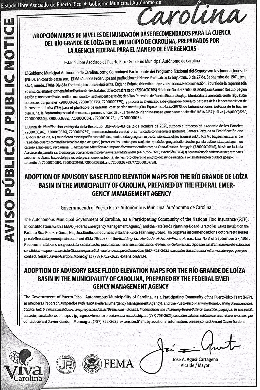 Aviso Público – Adopción Mapas de Niveles de Inundación base recomendados para la cuenca del Río Grande de Loíza en el municipio de Carolina.